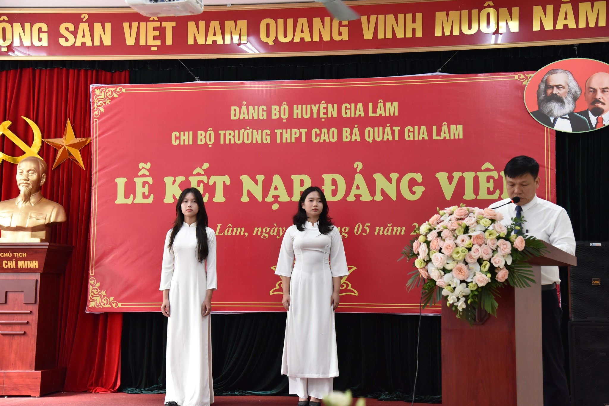 Phát biểu tại Lễ kết nạp, Phó Bí thư Thường trực Huyện ủy Gia Lâm Nguyễn Tiến Việt chúc mừng Chi bộ Trường THPT Cao Bá Quát, BGH Nhà trường và gia đình đã có đảng viên trẻ xuất sắc, người con ngoan - trò giỏi. Đồng chí Phó Bí thư Thường trực Huyện ủy khẳng định, trở thành đảng viên Đảng Cộng sản Việt Nam là niềm vinh dự to lớn, song cũng là nhiệm vụ hết sức nặng nề và nhắn nhủ 02 đồng chí đảng viên trẻ phải luôn ghi nhớ và thực hiện tốt nhiệm vụ của người đảng viên; gương mẫu thực hiện, đồng thời vận động người thân, bạn bè chấp hành tốt chủ trương, đường lối của Đảng, chính sách, pháp luật của Nhà nước, nội quy, quy định của địa phương, của trường, của lớp... Đồng thời mong muốn, từ sự khởi đầu ý nghĩa này, các em học sinh trường THPT Cao Bá Quát sẽ tiếp tục phấn đấu, rèn luyện, trở thành cầu nối, mang tâm tư nguyện vọng của học sinh đến với Chi bộ và các thầy cô; xây dựng trường học văn minh, học sinh thân thiện. Đối với cấp uỷ Đảng, chi bộ nơi cư trú của các quần chúng ưu tú và đảng viên là học sinh THPT cần chủ động phối hợp với cấp uỷ các trường THPT bồi dưỡng, giúp đỡ quần chúng, đảng viên trẻ cư trú trên địa bàn; tiếp nhận, quản lý đảng viên khi hoàn thành học tập tại Nhà trường về địa phương theo quy định.