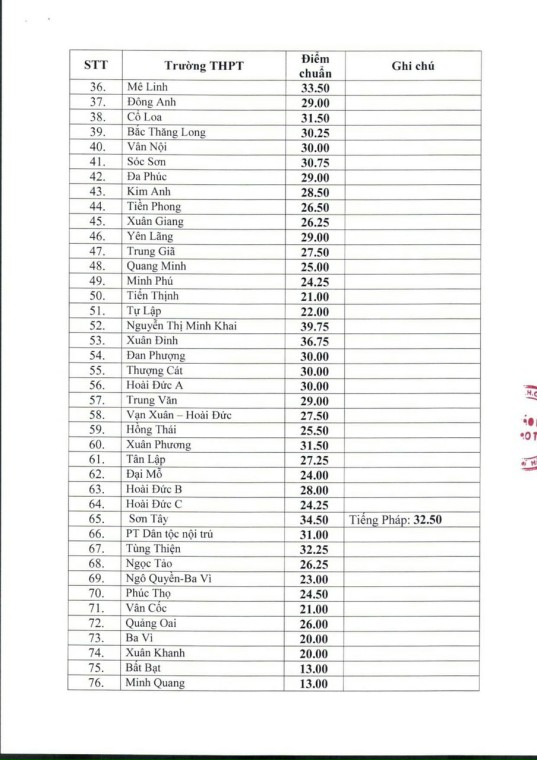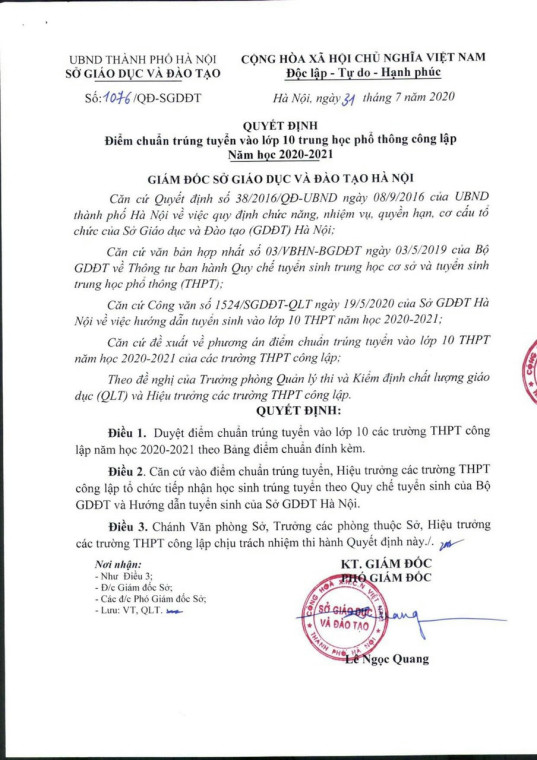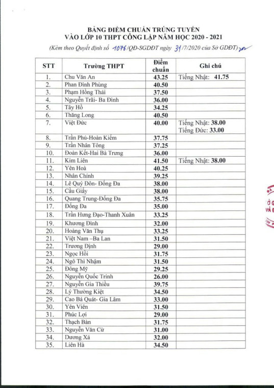Điểm chuẩn trúng tuyển vào lớp 10 trung học phổ thông công lập năm học 2020-2021