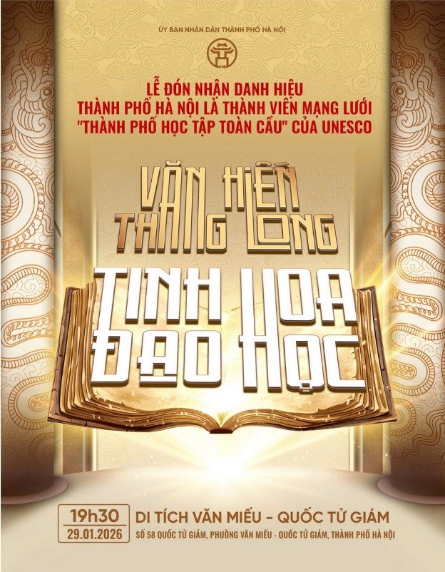Hà Nội sẽ tổ chức Lễ đón nhận danh hiệu “Thành phố học tập toàn cầu” của UNESCO vào ngày 29/01/2026 tại Trung tâm Hoạt động Văn hóa Khoa học Văn Miếu - Quốc Tử Giám, sự kiện được truyền hình trực tiếp trên kênh H1 - Đài Phát thanh và Truyền hình Hà Nội.