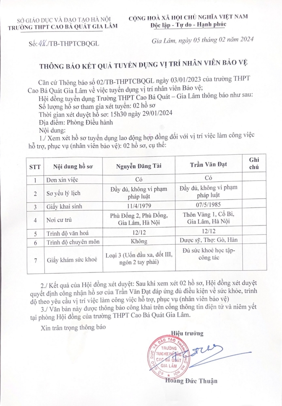 Kết quả tuyển dụng vị trí Nhân viên bảo vệ