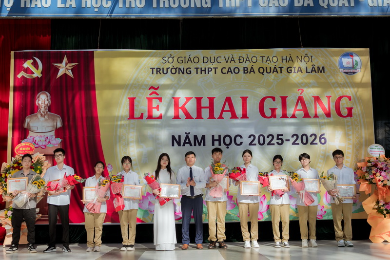 Trong khuôn khổ buổi lễ, nhà trường đã trang trọng tuyên dương và khen thưởng những gương mặt tiêu biểu, đạt thành tích xuất sắc trong năm học vừa qua. Đặc biệt, các Thủ khoa, Á khoa kỳ thi tuyển sinh vào lớp 10 năm 2025 được vinh danh như niềm tự hào của thế hệ học sinh mới, thể hiện tinh thần hiếu học và nỗ lực không ngừng. Bên cạnh đó, nhà trường cũng ghi nhận và chúc mừng các em học sinh lớp 12 khóa K62 đã xuất sắc hoàn thành Kỳ thi Tốt nghiệp THPT năm 2025, tiếp tục viết nên những trang thành tích đáng tự hào, góp phần khẳng định chất lượng giáo dục và truyền thống dạy tốt - học tốt của Trường THPT Cao Bá Quát - Gia Lâm.